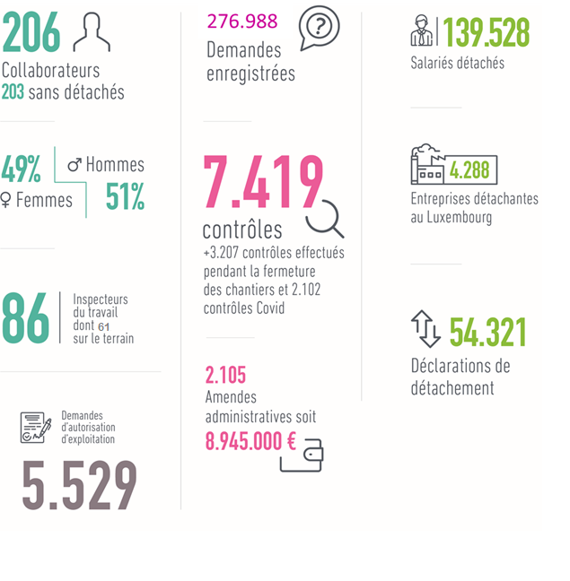 Toutes activités confondues, en 2020, l’ITM a traité 276.988 demandes, effectué 7.419 contrôles (sans compter les 3.207 contrôles effectués pendant la fermeture des chantiers et 2.102 contrôles COVID-19) et infligé 2.105 amendes administratives pour un montant total de 8.945.000 euros.