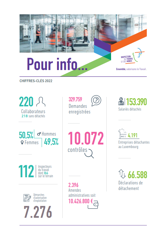 En 2022, l’ITM a traité 329.759 demandes, effectué 10.072 contrôles et infligé 2.396 amendes administratives pour un montant total de 10.426.800 euros. Nos inspecteurs ont effectué un large éventail d’inspections, y compris celles liées à la sécurité et à la santé au travail, aux heures de travail, aux salaires.