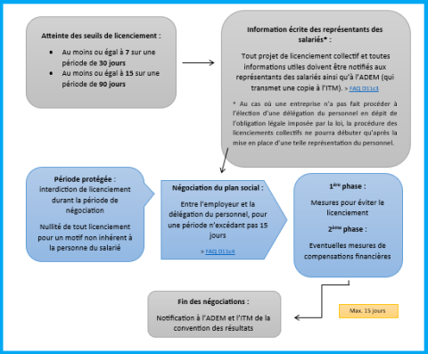 L’employeur est obligé de notifier par écrit, au plus tard au début des négociations du plan social, tout projet de licenciement collectif à l’ADEM qui en transmettra copie à l’ITM. L’employeur est tenu de transmettre aux représentants des salariés copie de cette notification à l’ADEM.